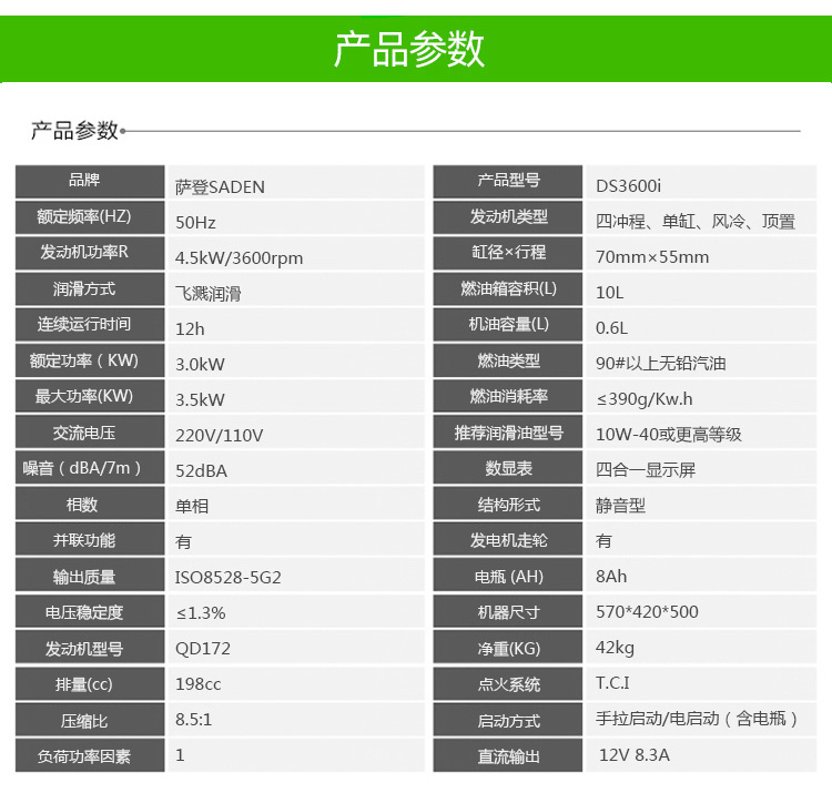 薩登3kw小型靜音汽油發電機DS3600i
